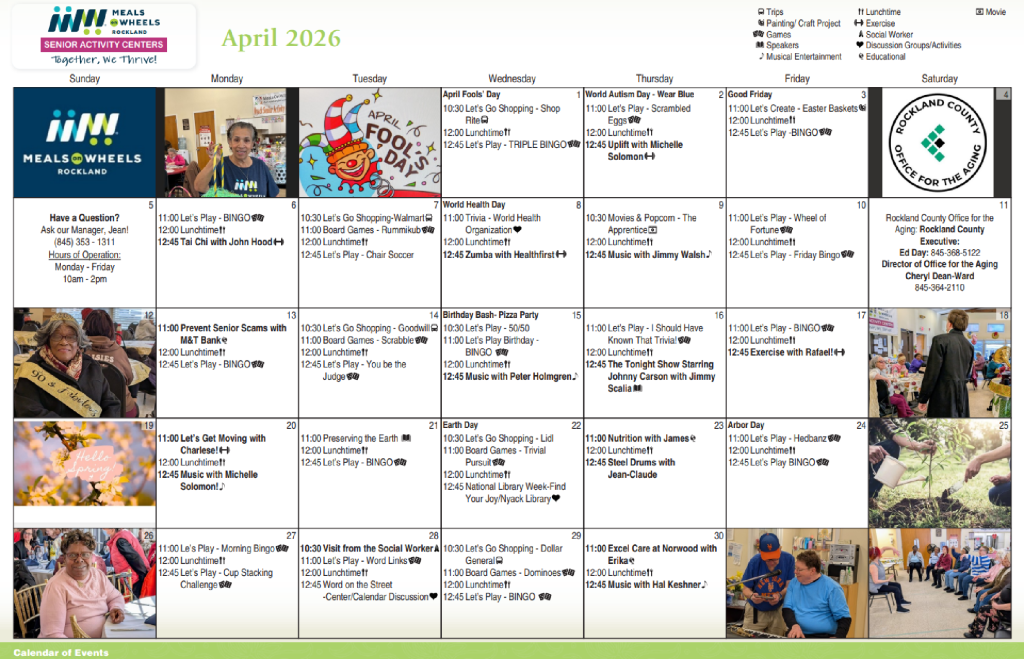 This program is supported in part by the Rockland County Office for the Aging, the New York State Office for the Aging, the Administration on Aging and the County of Rockland. Contributions are voluntary and confidential and used to expand services. Services will not be denied if unable or unwilling to contribute. For those who self-disclose income at or above 185 percent of the Federal Poverty Level, the suggested contribution is equal to the service cost.