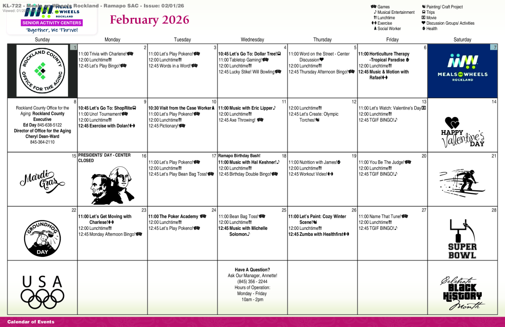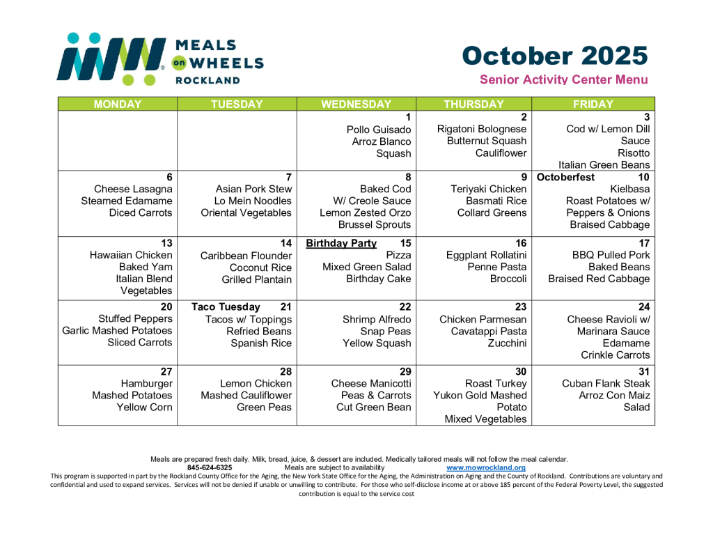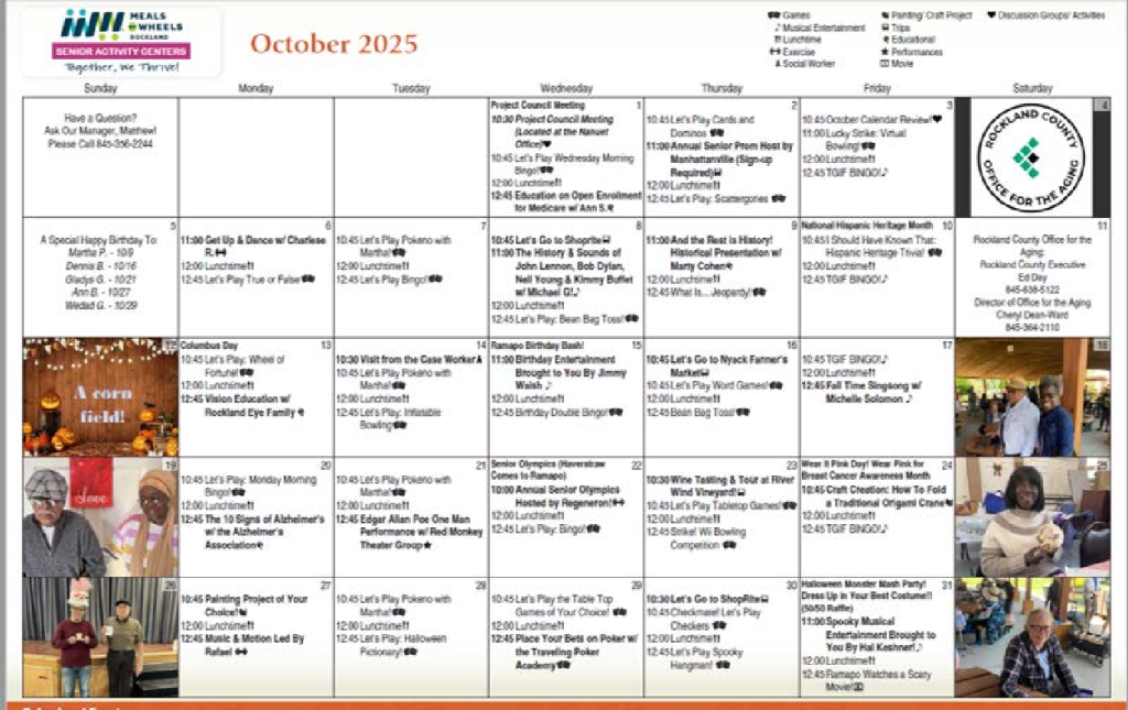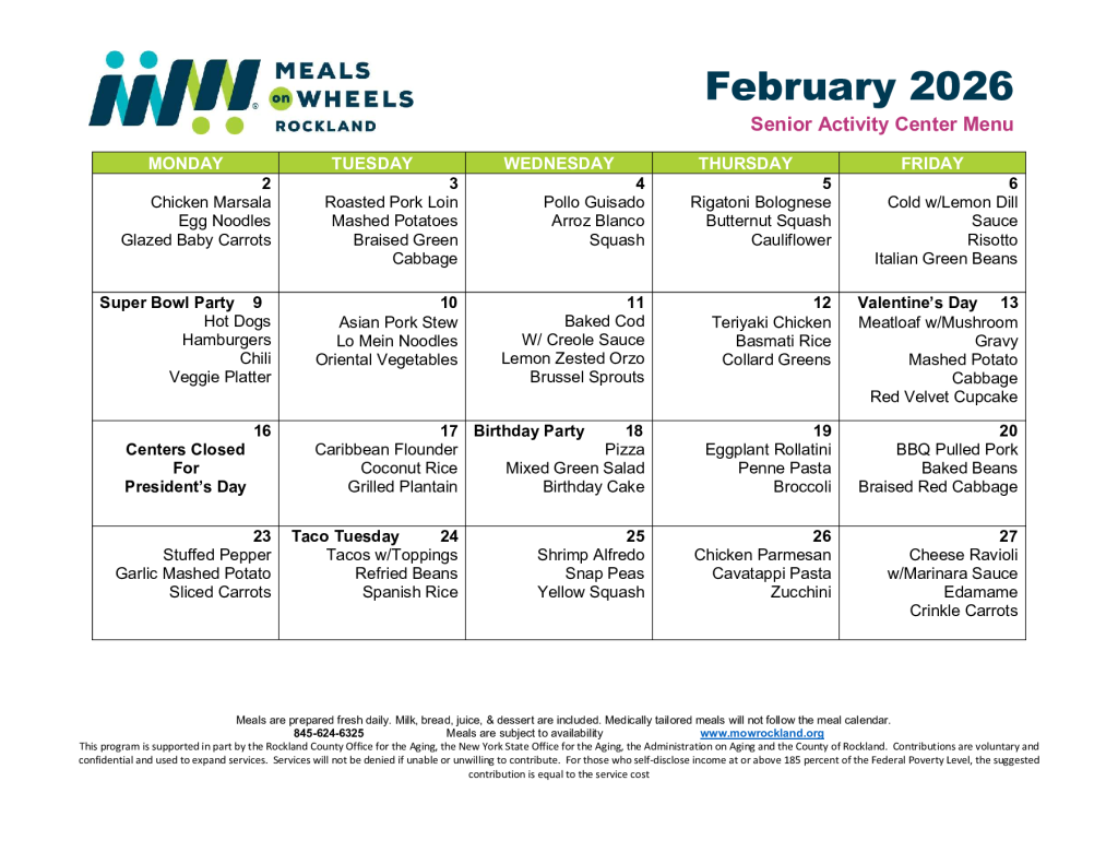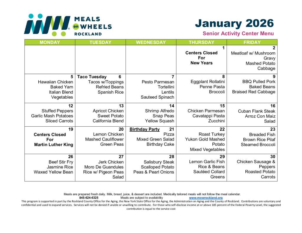 This program is supported in part by the Rockland County Office for the Aging, the New York State Office for the Aging, the Administration on Aging and the County of Rockland. Contributions are voluntary and confidential and used to expand services. Services will not be denied if unable or unwilling to contribute. For those who self-disclose income at or above 185 percent of the Federal Poverty Level, the suggested contribution is equal to the service cost.
